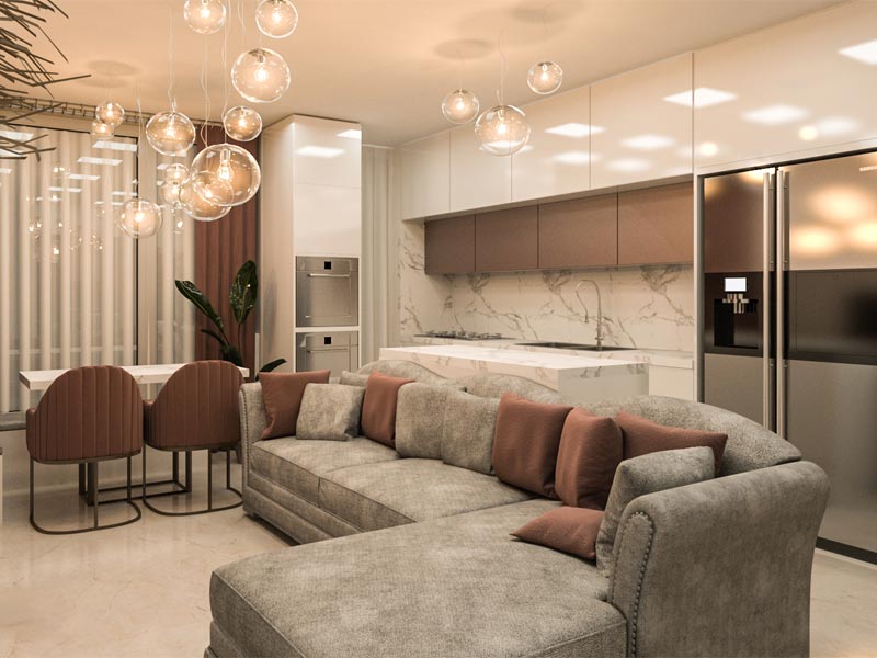 انتخاب رنگ دیوارها، پوشش کف، نورپردازی، نوع مبلمان، پردهها و حتی جزئیات دکوراتیو، بهصورت دقیق و هماهنگ با طراحی انجام میشود.