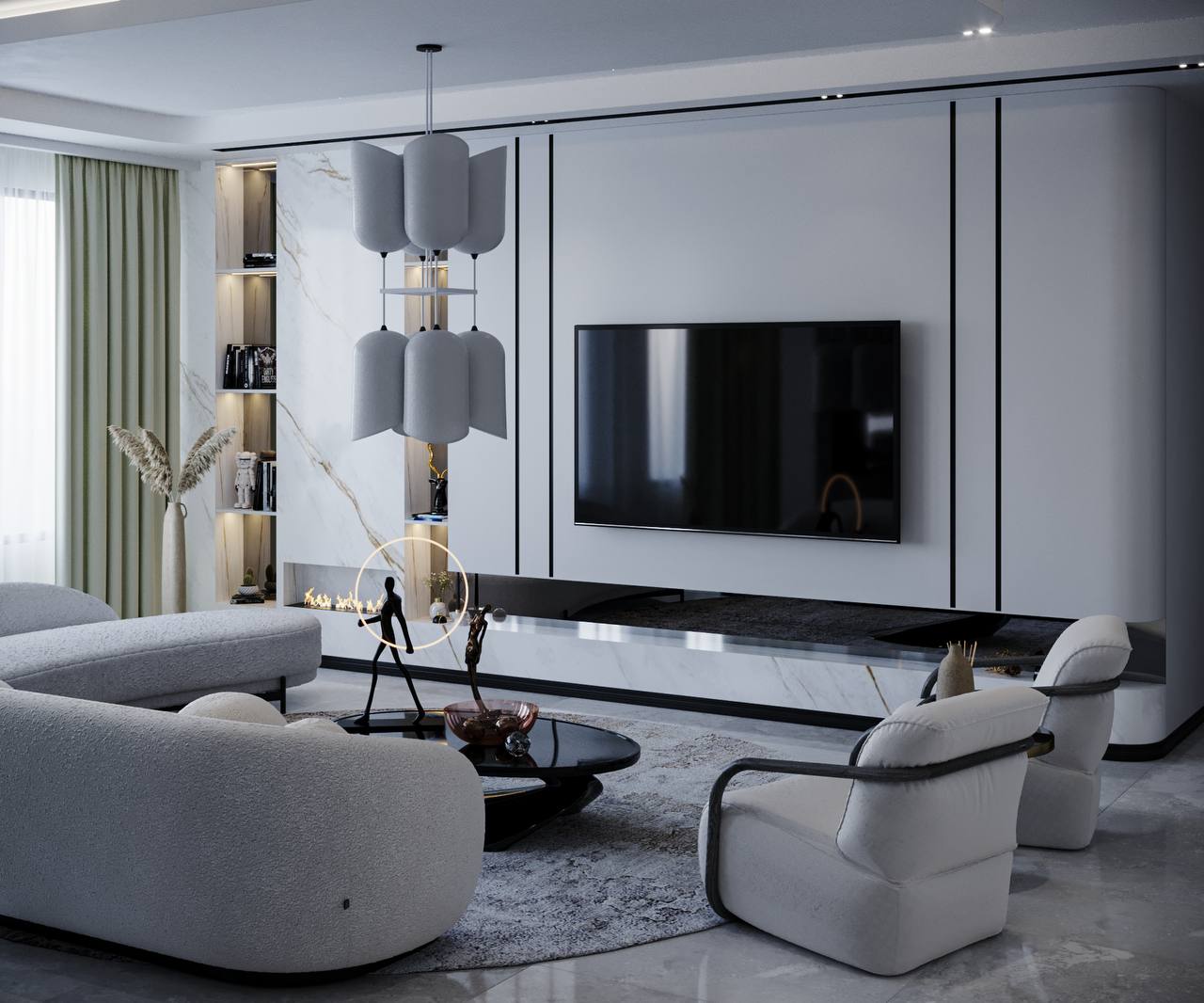 ترکیب پالت رنگی خاکستری و سفید، نورپردازی مخفی در سقف، مبلمان مینیمال، سیستم صوتی هوشمند و پردههای برقی.